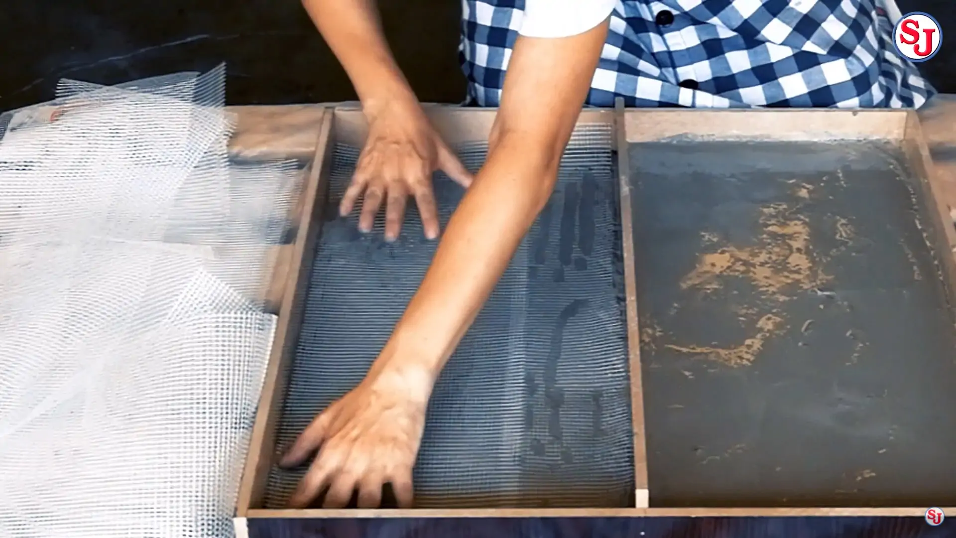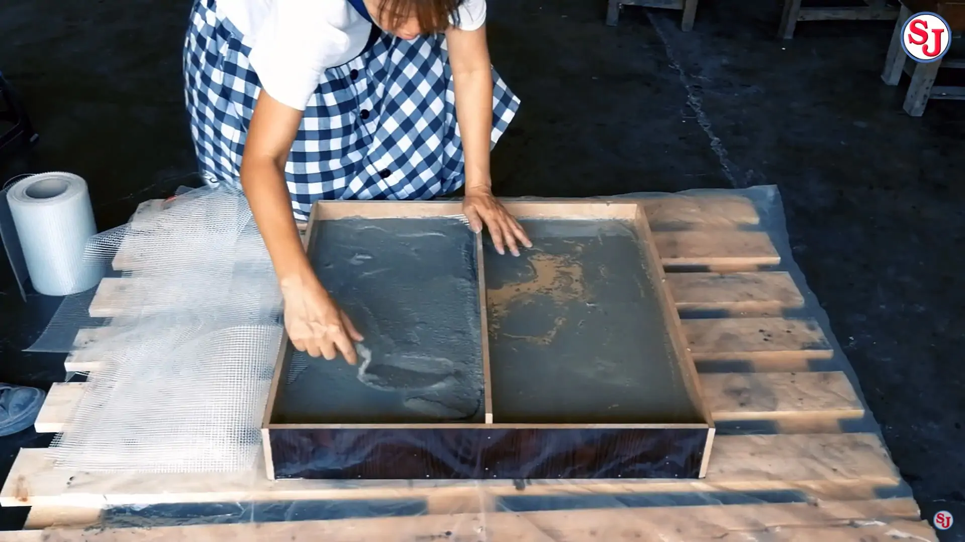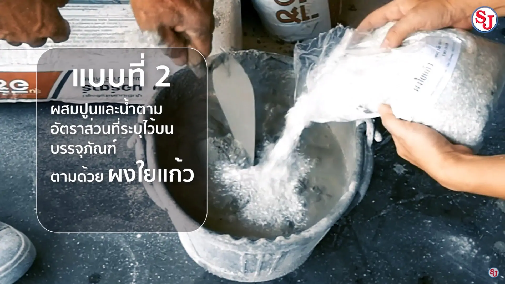 ผสมปูนและน้ำตามอัตราส่วนที่ระบุไว้บนบรรจุภัณฑ์ ตามด้วยผงใยแก้ว และทำการผสมให้เข้ากัน