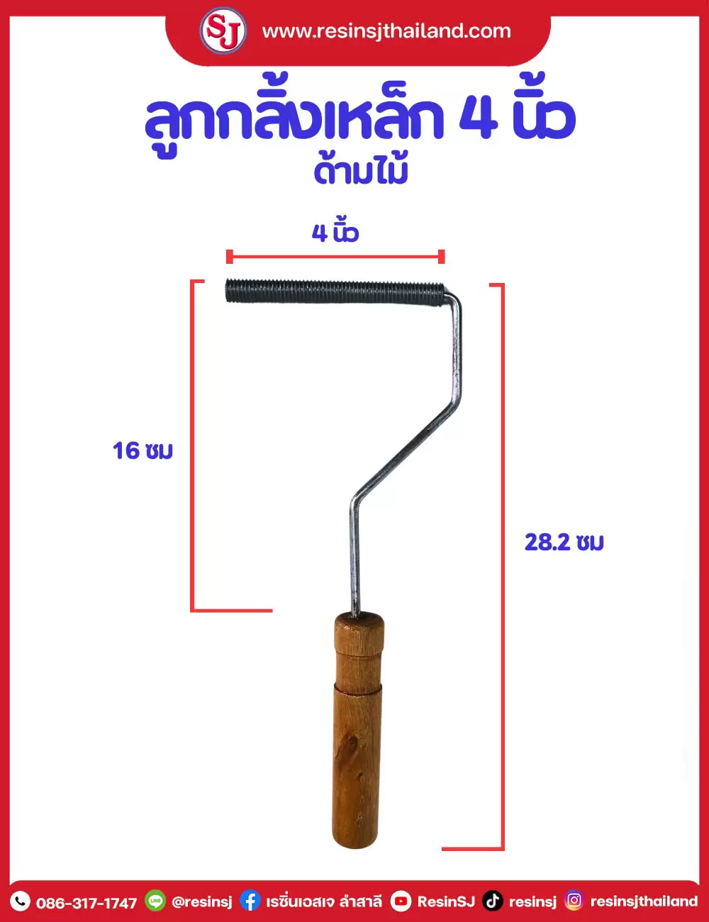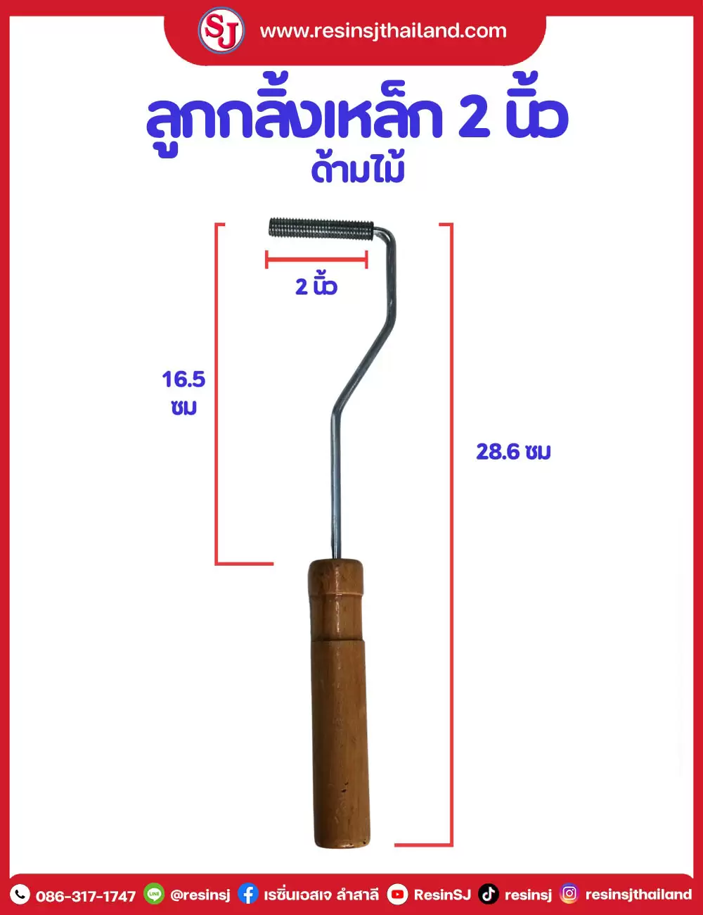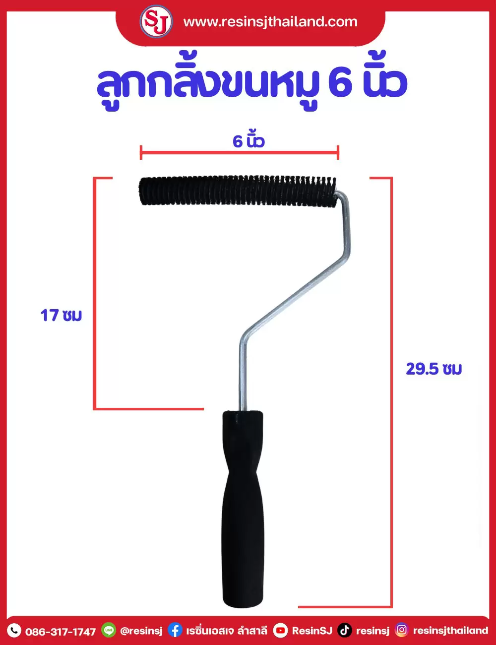 1.ลูกกลิ้งขนแกะ ทำจากขนแกะแท้ มีขนาด4นิ้ว ใช้จุ่มน้ำยาเรซิ่นแล้วเลย์งานไปทั่วแผ่นใยที่เตรียมไว้ การใช้ลูกกลิ้ง ช่วยให้เรซิ่นไปได้ทั่วถึงชิ้นงาน อย่างแท้จริง ขณะใช้ควรออกแรงกด เพื่อให้น้ำยาเรซิ่นไม่เกาะติดโคนขนลูกกลิ้ง